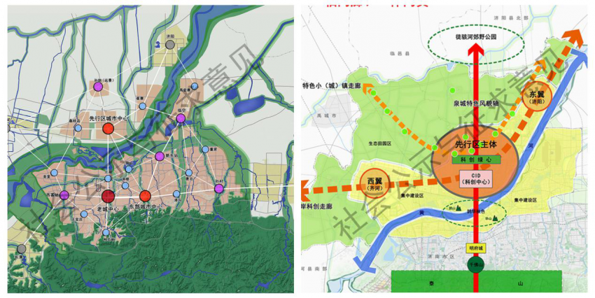 在“一轴两廊、一体两翼”的空间格局中,先行区1030平方公里的规划范围内,先行区东翼独占530平方公里。从“一主两副五次十二中心四卫”的区域城市中心体系看,先行区东翼作为卫星城市,是城市扩容的重要载体。并以济南北部产业聚集地与经济发展高地,成为携河北跨的新动能,是直面济南的第一道大门,无缝链接黄河两岸。
