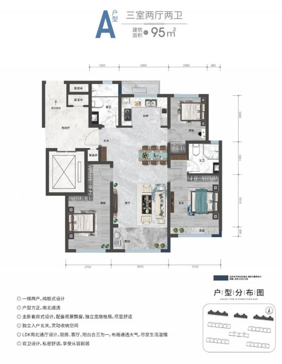 建面约95㎡三室两厅两卫,LDK一体化设计、三开间朝南、270°转角窗,双卫设计……空间合理利用,满足你对生活的想象;建面约110㎡三代同堂之家,6.6米阔景阳台、中西厨设计、嵌入式衣橱,大空间布局,满足不同阶段家庭对于居住的需求,未来的生活图景跃然眼前。