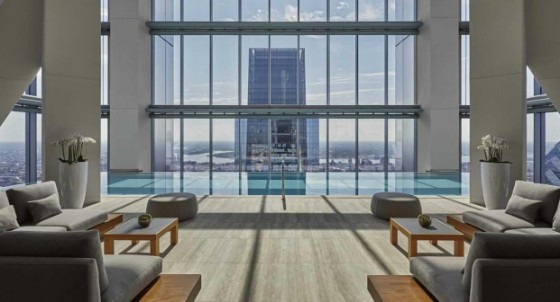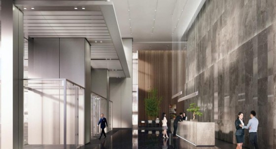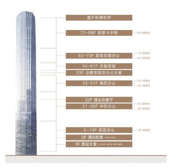 首层办公大堂,层高约13.05m;首层公寓大堂、首层酒店大堂、32层办公空中大堂、53层办公/公寓空中大堂、73层酒店空中大堂。