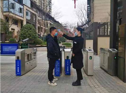 特殊时期,龙湖各社区实行严格的门禁管控制度。龙湖智慧服务配置专门的工作人员在出入口对进出社区的人员进行体温检测。另外,对于外卖及快递人员,则一律不得进入,减少感染机会,保障社区安全。
