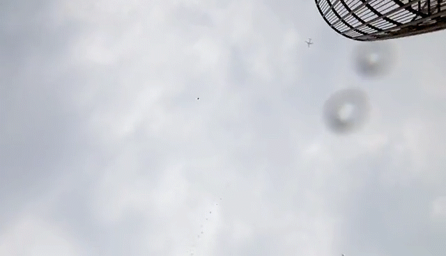 其中一组水火箭升空时刚好有飞机经过好似与飞机肩并肩!