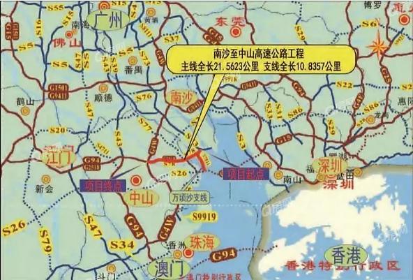 南沙至中山高速公路(南中特大桥工程)途经广州市南沙区、中山市港口镇、民众镇、火炬开发区。包括南沙至中山高速公路主线、万顷沙支线两部分。