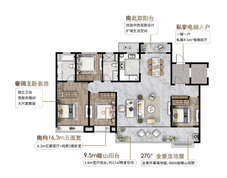 舜山府,以其270°的环幕落地窗和横向五面宽,成就无界山居视野。天宸原著,在此基础上产品再跃升!以85%的超高得房率,成就约16.3米极致环山五面宽,仅仅是客厅就宽达6.3米,三间主卧全部为南向。