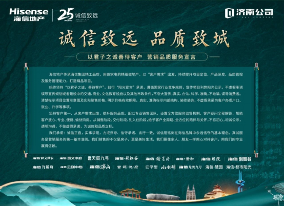 2020年,海信地产郑重提出“诚信致远,品质致城”品牌主张,并不断践行、兑现品质承诺,2020年12月12日,海信地产携济南首个全纬七彩样板空间于海信翰墨府彩虹绽放。包括有社区大门、实景景观、公共区域、精装地库、首层大堂、工法样板、实体样板间七大关键空间的全面开放,让海信翰墨府成为了济南市场唯一在交付前一年半就能看到全面交付实况的小区,为全城高品质置业体验揭开了崭新的一页。