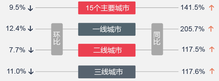 ▌交易:上周楼市整体成交下降,各线环比均降
