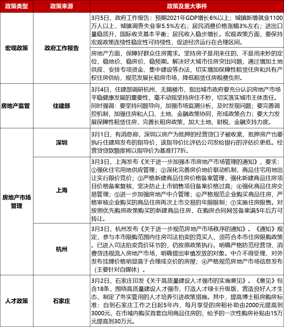 政府工作报告:坚持“房住不炒”定位,稳地价、稳房价、稳预期,解决好大城市住房突出问题。住建部赴杭州、无锡调研指出,地方政府应切实落实城市主体责任。上海发布楼市新政,合理制定土地出让方案,优先购房5年后方可转让。杭州进一步加强住房限购,法拍房纳入限购范围。石家庄发布人才政策,提高博士补贴标准。