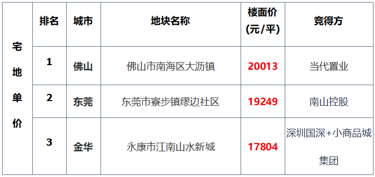▌宅地单价:榜单均价走低,佛山南海区宅地领跑