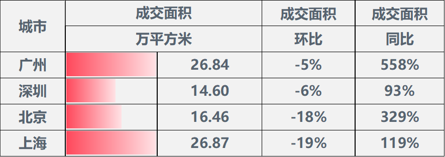 表:一线城市成交面积同环比情况