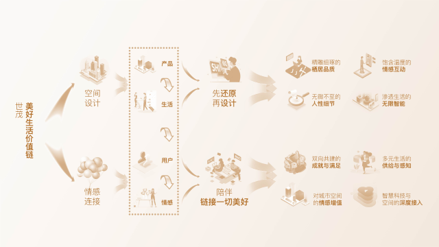 从产品到用户,世茂以领先行业的远见提出全新的主张:唯有打通与用户关联的各环节,找到一条全新的美好价值链条,才能串联起真正有温度、有故事、有向往的生活图景。而这就是世茂“产品-生活-用户-情感”美好价值链的源起。