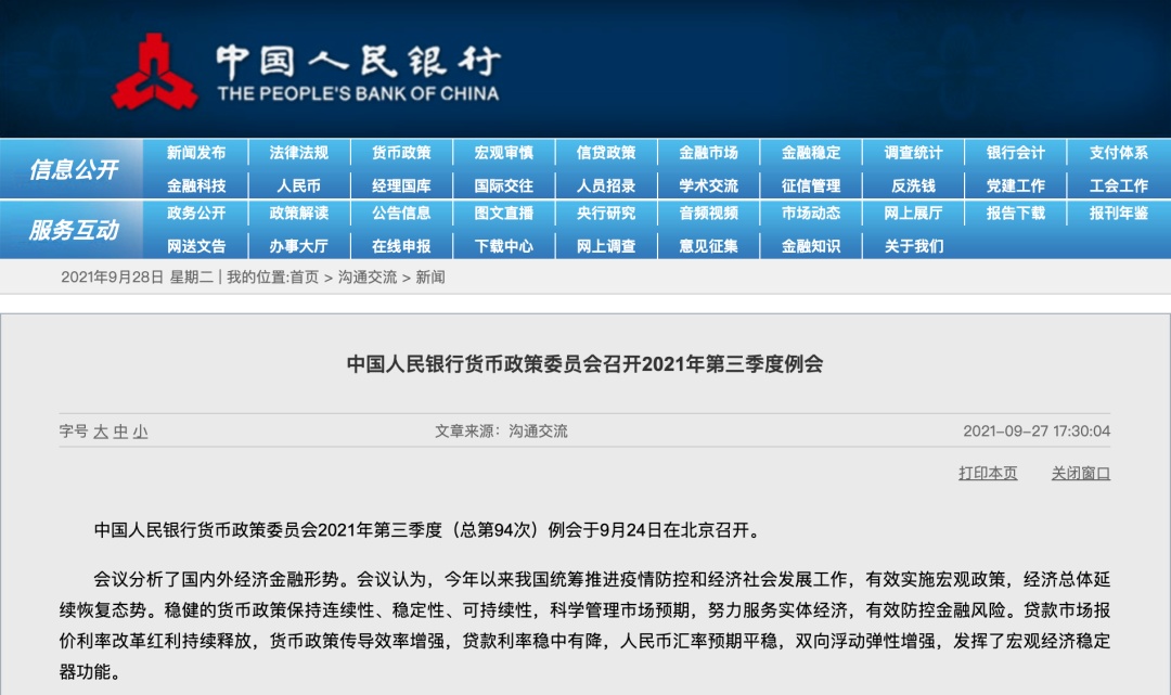 中国人民银行9月27日消息称,货币政策委员会2021年第三季度例会于9月24日召开,会议分析了国内外经济金融形势。