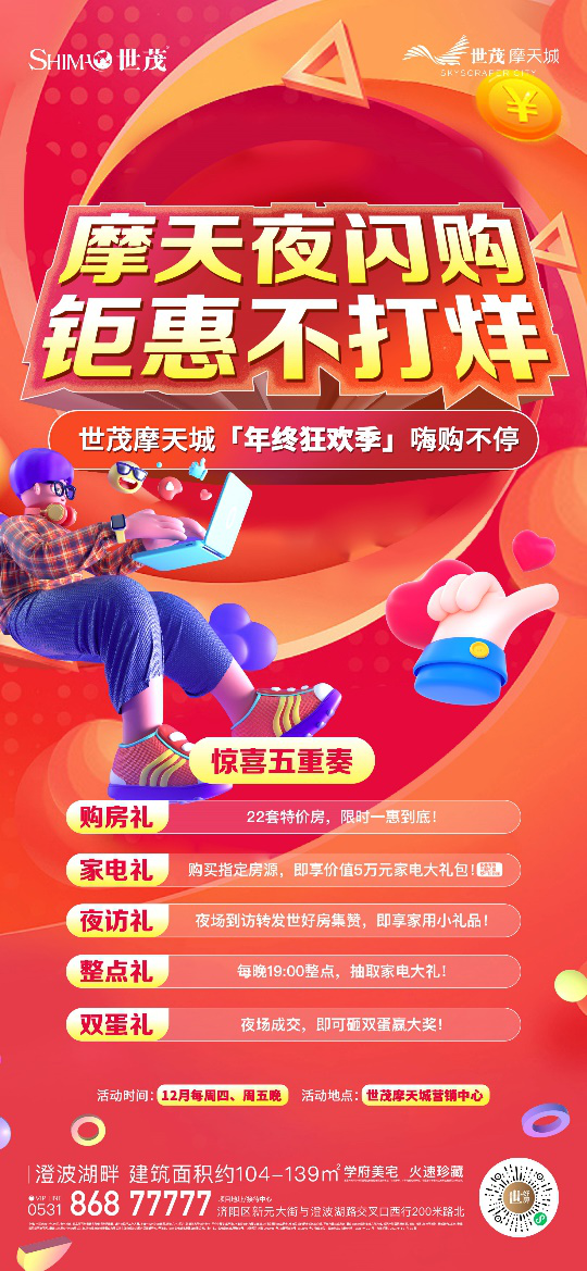 本活动的内容、时间、参与对象、礼品等可能根据实际情况进行调整,请咨询现场工作人员。本宣传资料为示意图,所有文字、图片、数据信息等仅供参考,不作为要约或承诺。本宣传资料为要约邀请。对项目周边商业配套、教育及其他配套设施的介绍,不作为要约或承诺,最终以政府规划批准文件为准。相同户型因开发分期、楼栋、楼层、单元等差别,局部结构、采光、景观、面积等可能不同,最终以房屋交付时的现状为准。济南世茂新发展置业有限公司在法律规定范围内保留解释权。开发商:济南世茂新发展置业有限公司;推广名:世茂摩天城,预售证号:济建预许济阳2019035号、济建预许济阳2018106号;物业单位:世茂物业;制作时间:2021年12月;有效期限:2021年12月31日。