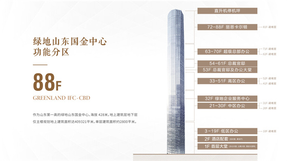 作为省内最高的垂直复合型超高层建筑,绿地山东国金中心共计规划88层:2F宴会厅、会议室,3-19F低区甲级办公,21-30F中区甲级办公,32F配套了专属服务于入驻企业的绿地塔尖会客厅,54-60F总裁官邸,63-70F超级总部办公,72-88F于2019年引进了省内首家超五星级酒店丽思卡尔顿酒店,顶层为停机坪。