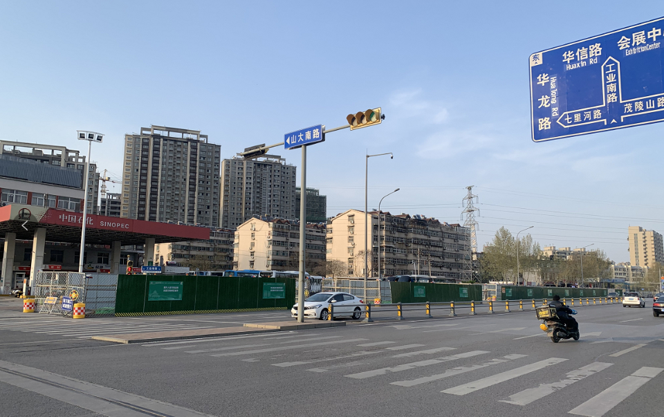 据此前发布的交通组织公告,山大南路站总工期约64个月,分两期围挡实施绿迁、新建导改道路及管迁、主体盖板施工。目前,该站处于一期工程阶段。主要进行绿迁及新建导改道路施工,对山大南路(二环东路以东)南北南侧部分绿化带及非机动车道、人行道进行围挡。