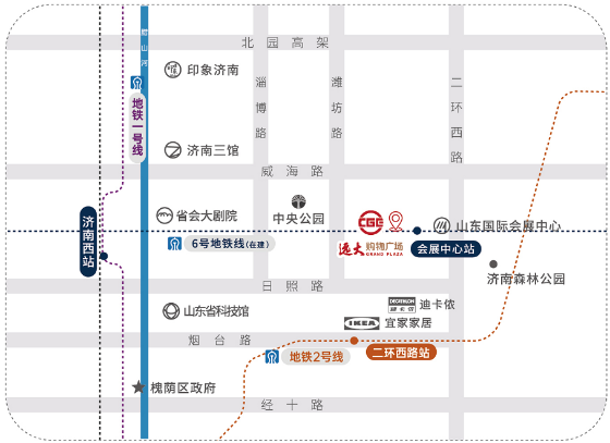 远大购物广场,邻近西客站交通枢纽, 高铁、高速、高架、公共交通纵横交织,通达八方;紧邻地铁2号线(二环西路站),接驳建设中的地铁6号线(会展中心站),双线地铁加持,汇聚全城人潮,坐享“轨交济南”战略红利。