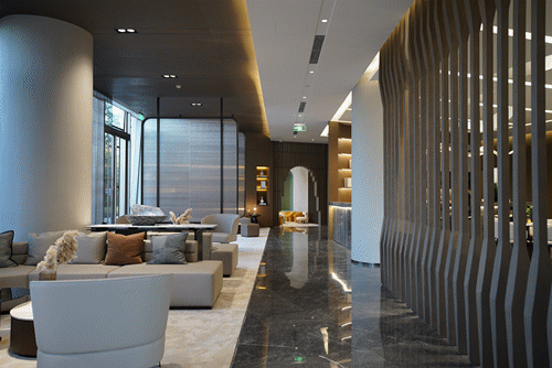 从“源于泉”到“承于运”再至“汇入海”,营销中心接待大厅采用船与帆的元素,以扬帆起航之意开启美好体验;沙盘区取意乘风破浪;沙盘规划为一艘行船,与空中多个船型装饰映衬,营造出百舸争流的意境;洽谈区则构建出船行水面的建筑意向,透过通透的落地窗,聆听窗外管钟轻响,仿似波浪轻打船舷,不仅切身体会自然里的生活,更是一个近山亲水的理想山河改善大宅的呈现。