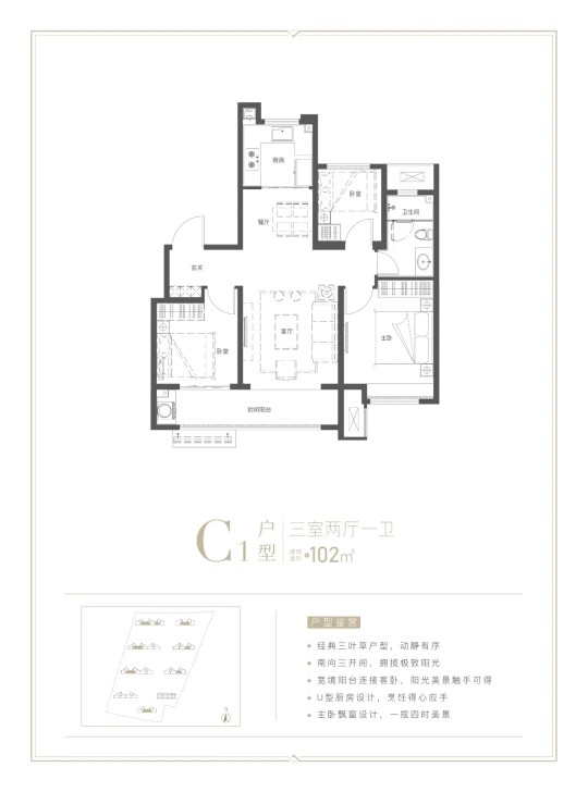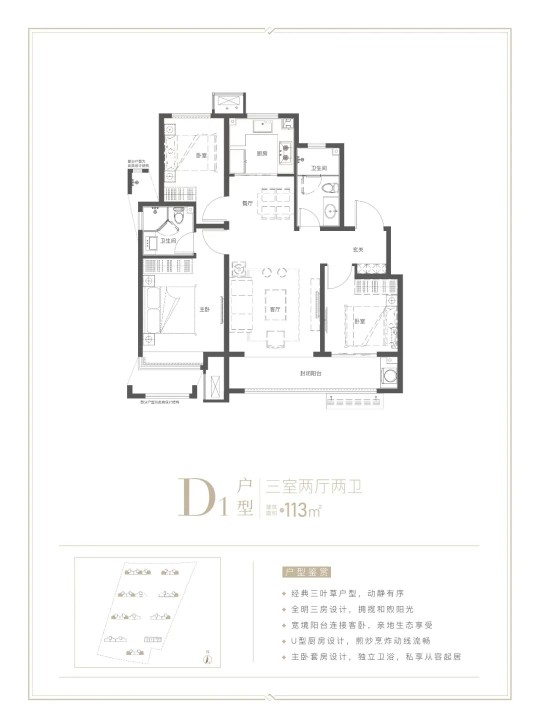 建面约113㎡三室两厅两卫户型,经典三叶草户型, 南北通透的LDK布局;全明三房设计,拥揽和煦阳光;主卧套房,独立卫浴,臻享私密、尊崇高品质生活。