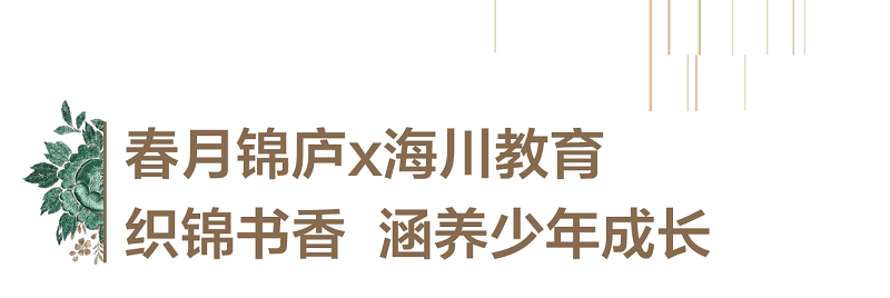 在春月锦庐的观念中,教育的格局从不止于课堂之中,春月锦庐携手海川教育!为下一代,织锦书香未来。从家到学校,从课堂到课外,绿城的孩子们应该拥有比书本更为辽阔的世界。