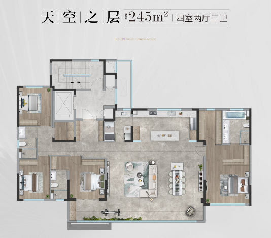 历经百位设计师倾力打造,融入对空间艺术、生活美学的理解,突破传统豪宅布局与想象,打造三面全明空间,外揽繁华内拥阳光拂面;双主卧总统套房,实现真正意义上的步入式衣帽间;LDKG一体化设计,从容待客,打造圈层社交生活场。