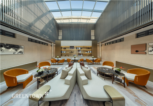 兼具功能与审美的社区大堂同样也是一个社区会客厅,内部由书吧阅读区、沙发休憩区、快递收发区和接待区4大共享空间组成。业主可以于此或阅读休闲或接待朋友、与邻居洽谈……当阳光铺满整个玻璃屋顶,社区的温情也于此生长。